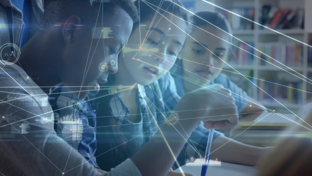 Young students sit closely together, engaging with a digital tablet. Technological graphics overlay their work, symbolizing modern education and the role of technology in learning. Captures themes of teamwork, digital innovation, and education in contemporary classroom settings. Ideal for illustrating articles on digital education, tech in schools, or diverse learning environments.