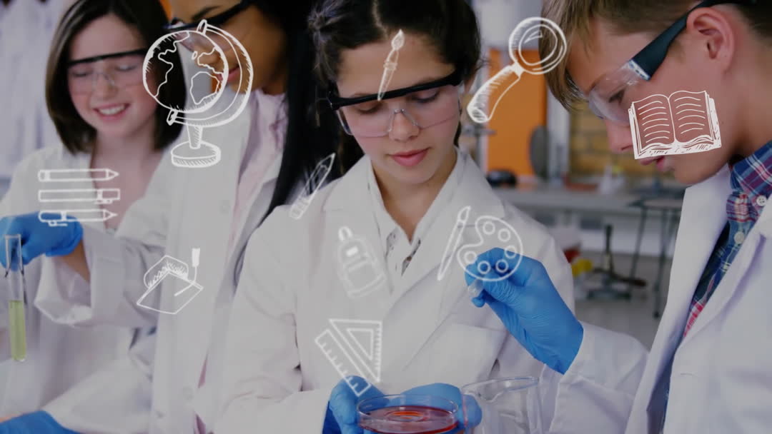 Students wearing lab coats and safety glasses, collaborating and conducting experiments in science lab, various scientific icons overlaid. Useful for educational materials, STEM promotion, diversity in education, classroom project ideas.