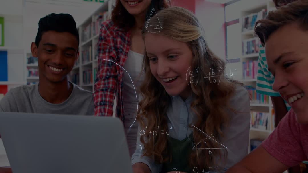 Group of enthusiastic students collaborating on a laptop in a library setting, with mathematical equations digitally overlaid to emphasize learning and critical thinking. Perfect for educational campaigns, online learning platforms, and innovation in teaching materials marketing.