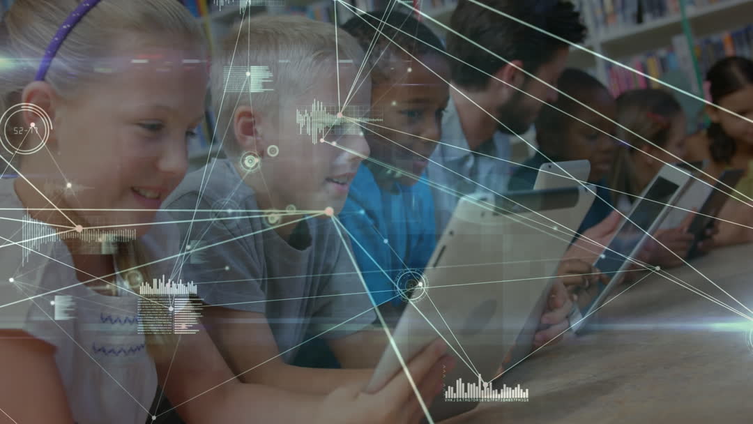 Young students from diverse backgrounds interact with tablets while a teacher guides them, highlighting connection networks. Suitable for illustrating modern education technologies, collaborative learning experiences, or showcasing the future of classroom environments driven by digital tools.