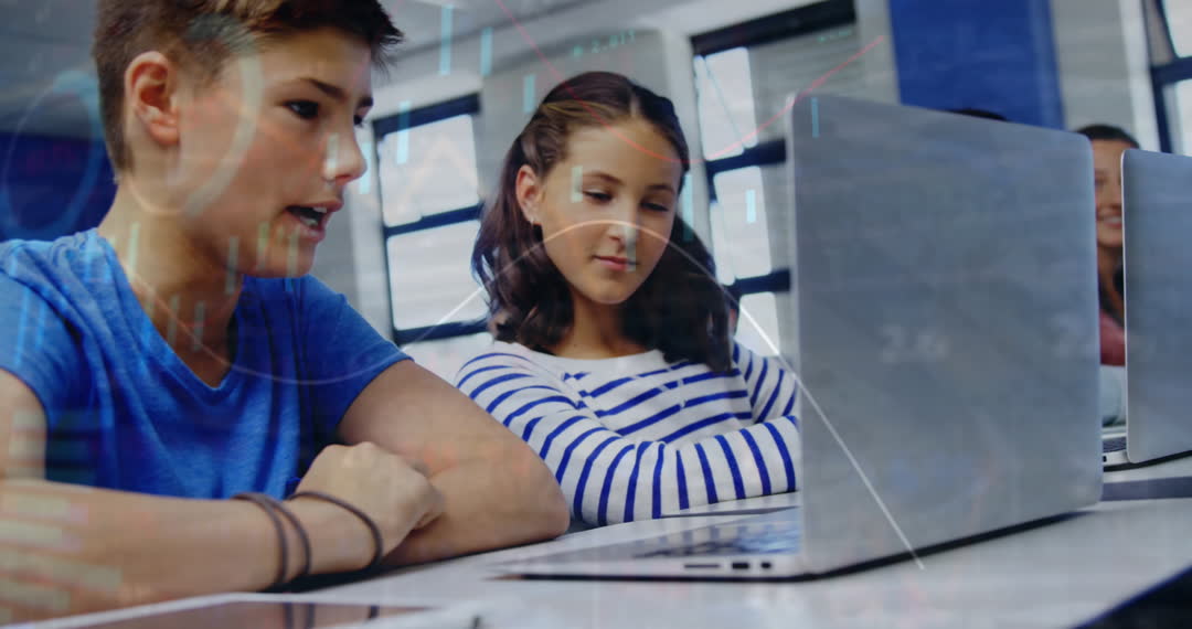 Young students actively watching a project on laptops in a modern classroom. Visible graphs and charts indicate a focus on digital learning tools and their importance in education. This visual is ideal for content related to modern educational methods, technology in schools, and collaborations among students in digital learning environments.