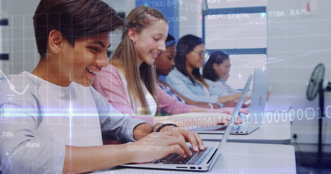 - Diverse Students Engaged in Technology with Data Overlay