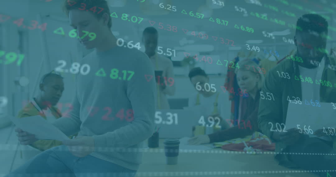 Image represents diverse group of students in a classroom setting engaging with digital devices. Stock board overlay implies a connection to analytics or data-driven environments, suitable for educational technology content, learning platforms, or collaborative tools in school or university contexts.
