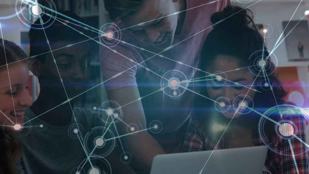Diverse group of students interact with technology at school, surrounded by digital network graphics. This suggests a future-focused educational environment where innovative teaching methods are used. Useful for illustrating educational articles, promotions for tech in learning, or visual content about digital transformation in schools.