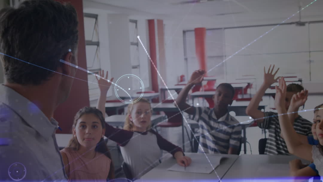 Children interacting with their teacher in a classroom overlayed with digital connections, illustrating the integration of technology in education. Can be used for topics related to innovative teaching methods, modern classroom environments, and educational technology.