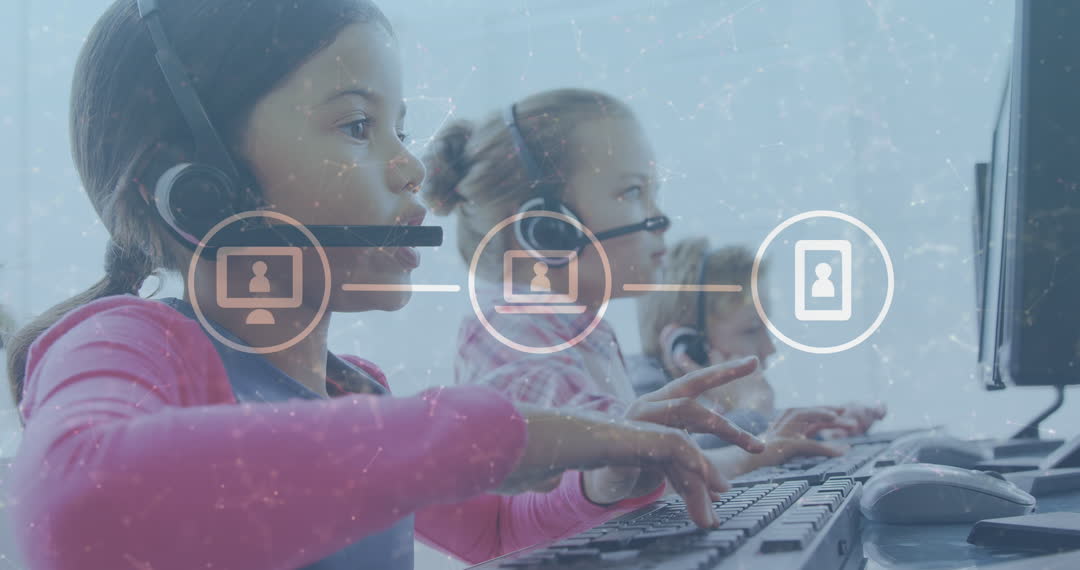 Children wearing headsets typing on keyboards exhibit an engaged learning atmosphere, highlighting the integration of digital tools in education. This concept suggests a modern, interactive classroom setting where diverse students interact not just locally but also potentially in a connected, online space. Useful for illustrating educational technology advancements and remote learning concepts.
