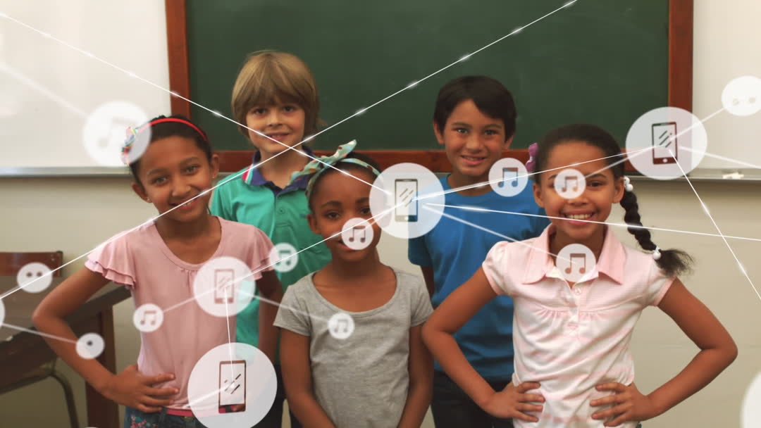 Smiling diverse students standing together in a classroom coordinate digital network icons. Image depicts modern integration of technology into education, emphasizing connectivity and interactive learning for young students. Useful for ads, educational materials, articles about technology in education or diversity in classrooms.