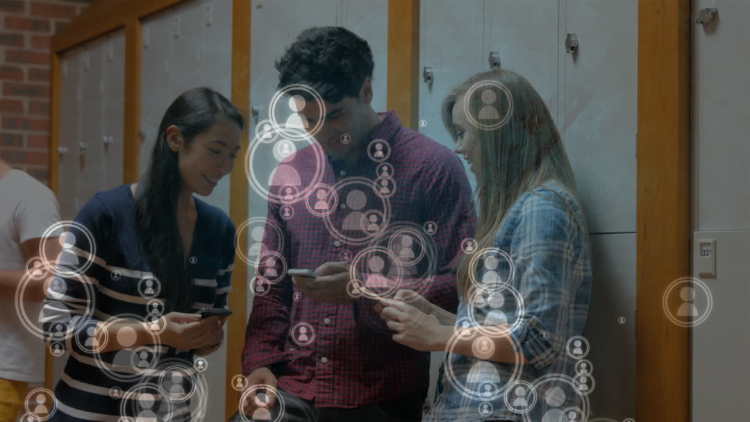 Diverse group of students in hallway engaging with digital concepts overlay symbolizing social media and connection. Useful for showcasing educational technology integration, student collaboration, and digital communication. Effective in illustrating modern education topics and technological advancements in academic environments.