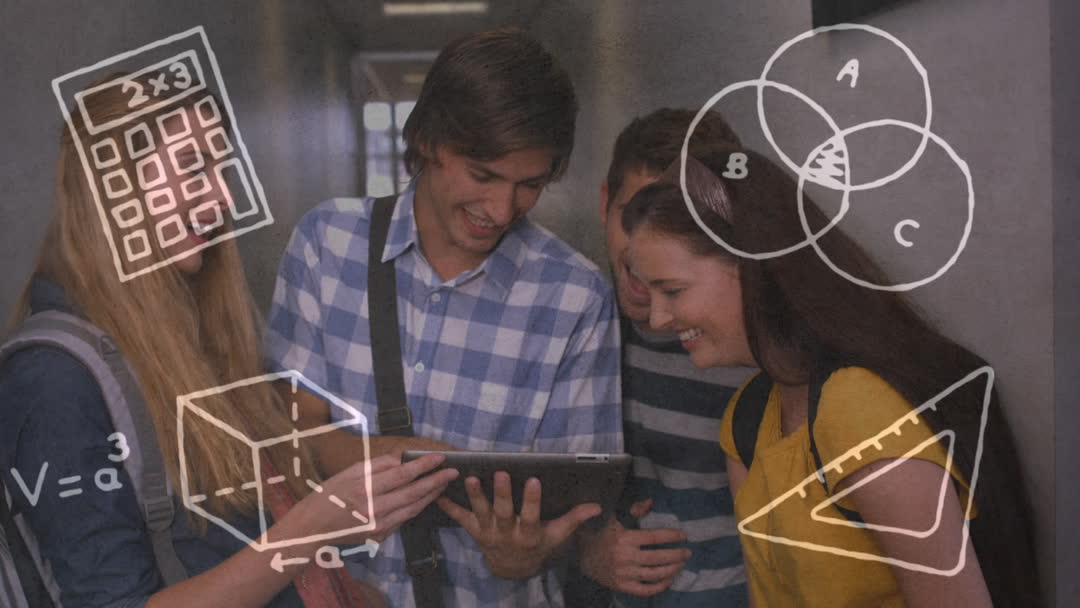 Young students gather around a tablet in a school hallway, actively engaging with digital educational content. Illustrations of mathematical symbols and diagrams overlay the scene, emphasizing academic themes. This video can be used in educational content, technology-oriented advertisements, or school-related promotional material showcasing student collaboration and modern learning environments.