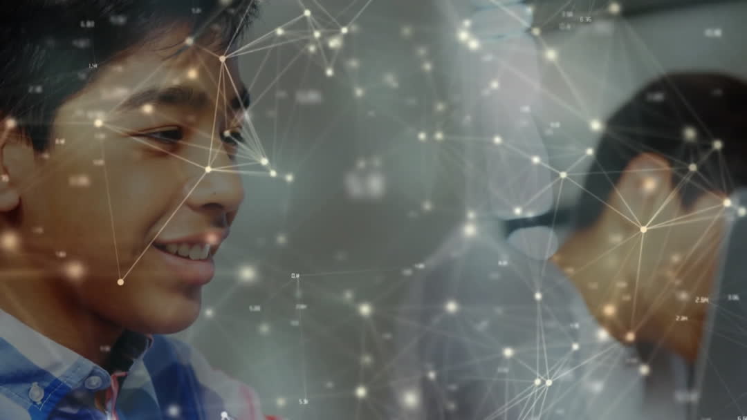 Visual illustrating schoolchildren engaging with digital interfaces overlayed with a network of connections. Suitable for use in materials focused on technology in education, digital learning advancements, and innovative classroom environments.
