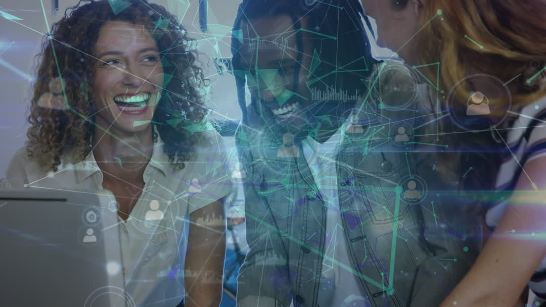 Group of diverse students smiling and engaging with technology, visualized with digital network overlays. This illustration captures the concept of connectivity and collaborative learning in modern education environments. Ideal for educational materials, technology-focused content, and teamwork-focused resources.