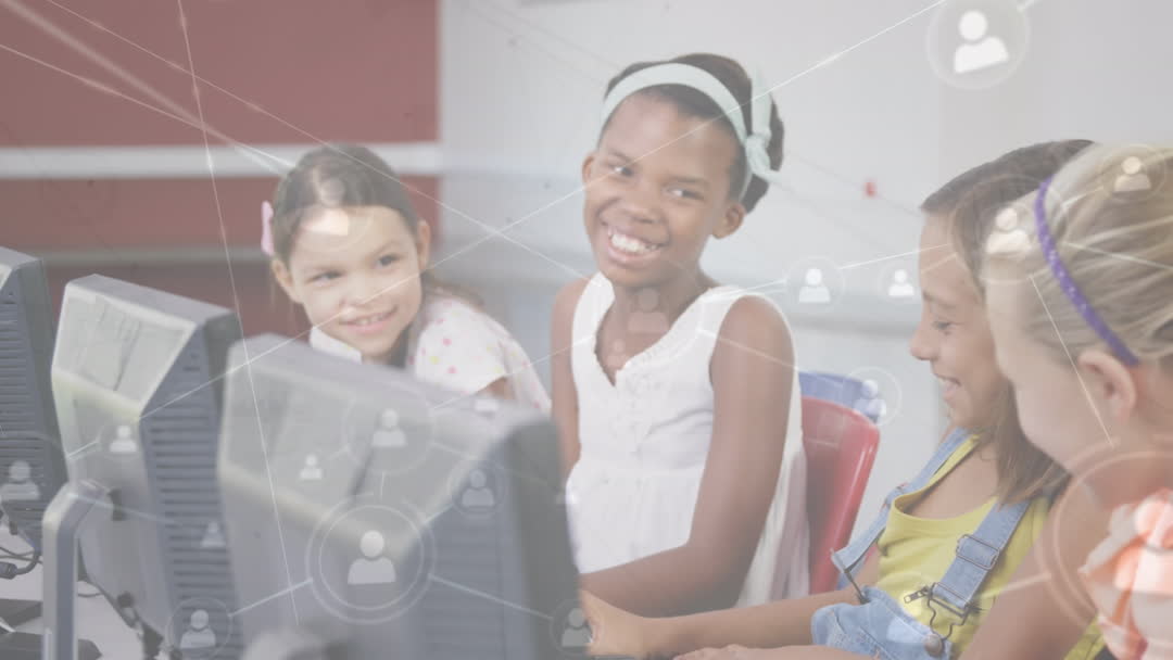 This video showcases diverse students happily using computers in a classroom setting, surrounded by digital network icons. It is perfect for themes related to modern education, technology in schools, digital learning environments, or unified connectivity in education. Suitable for use in educational materials, technology promotions, or articles discussing the impact of digital connectivity in diverse learning environments.