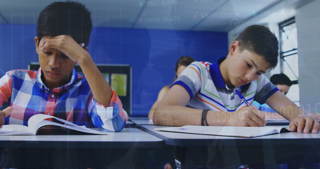 Diverse Students Studying in Classroom with Digital Graph Overlay Video