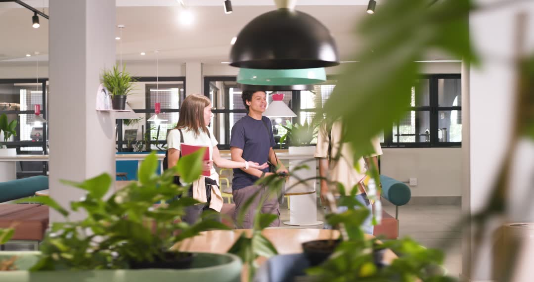 Video showing diverse students walking through campus lounge while collaborating with notebooks, headphones, and mobile devices. Foreground plants framing scene, creating fresh, modern vibe. Students greeting each other with handshake and high five, carrying backpacks and laptops. Scene working well for university marketing, campus life webpages, student recruitment campaigns, education social media, coworking space promotion, and corporate learning materials. Clips suitable for hero banners, background loops, B-roll for explainer videos, event promos, and presentation openers. Color palette featuring warm neutrals and green accents, usable for lifestyle branding and editorial features. Edit-friendly composition with shallow depth of field and natural motion, allowing flexible cropping and color grading.