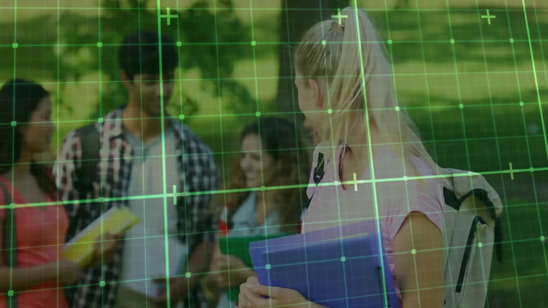 A group of diverse students stand together casually engaging while holding books, with digital data grid overlay suggesting technology integration in education. Scene illustrates fusion of everyday student life and modern data processing. Ideal for educational articles, descriptions of modern teaching methods, and analytics in education contexts.