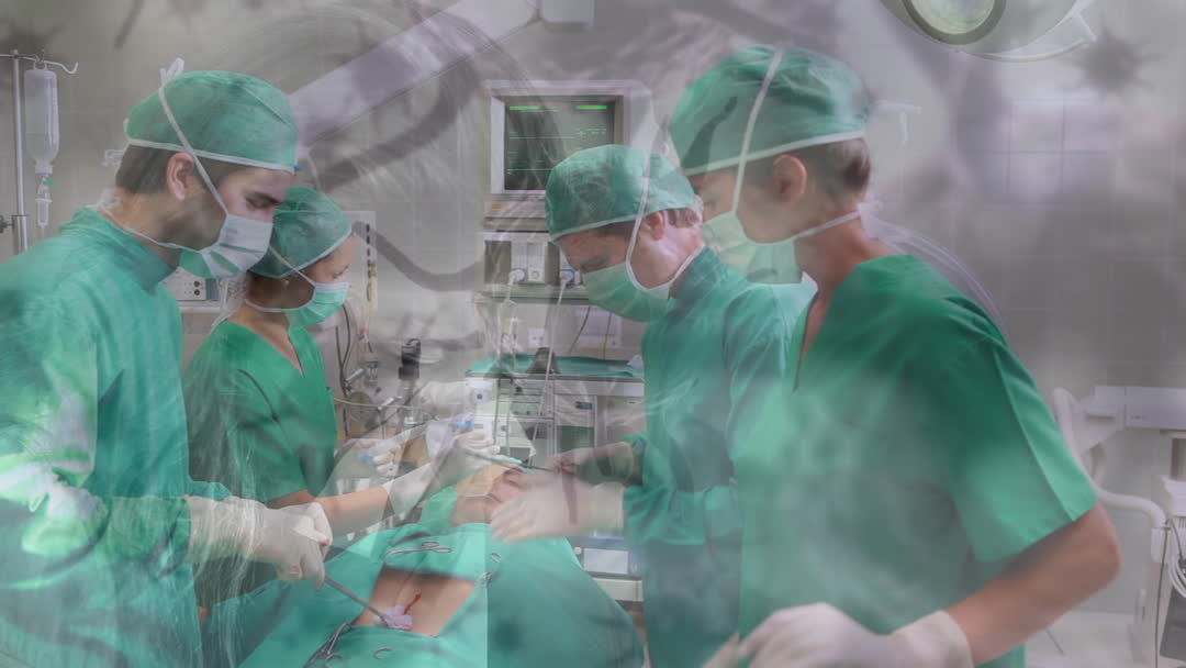 The video features a diverse group of surgeons wearing scrubs, masks, and gloves, performing a surgical procedure in a modern operating room. Overlayed are graphics of COVID-19 virus cells, symbolizing the challenges of performing surgeries during the global pandemic. This visual could be used for educational materials, presentations on healthcare resilience, infection control protocols in hospitals, and illustrations related to medical procedures during COVID-19.