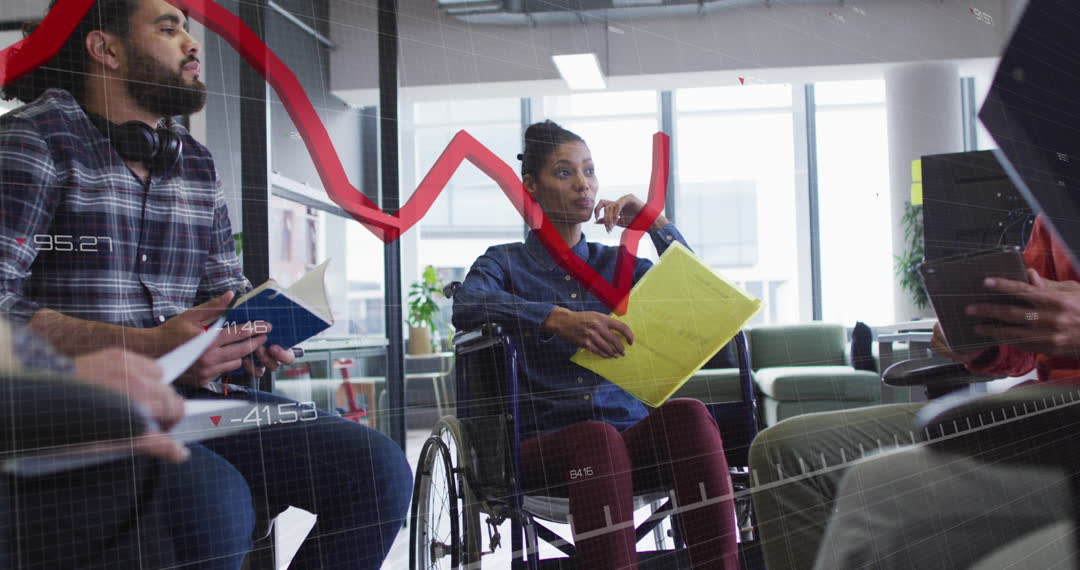 Group of diverse professionals brainstorming in modern corporate office setting. Female team member in wheelchair prominently contributing to discussion, indicating inclusive workspace. Translucent, dynamic financial graph indicates data-driven discussion. Ideal for use in articles, blogs on diversity and inclusion in the workplace, business analytics and data interpretation, or corporate strategy development training materials.