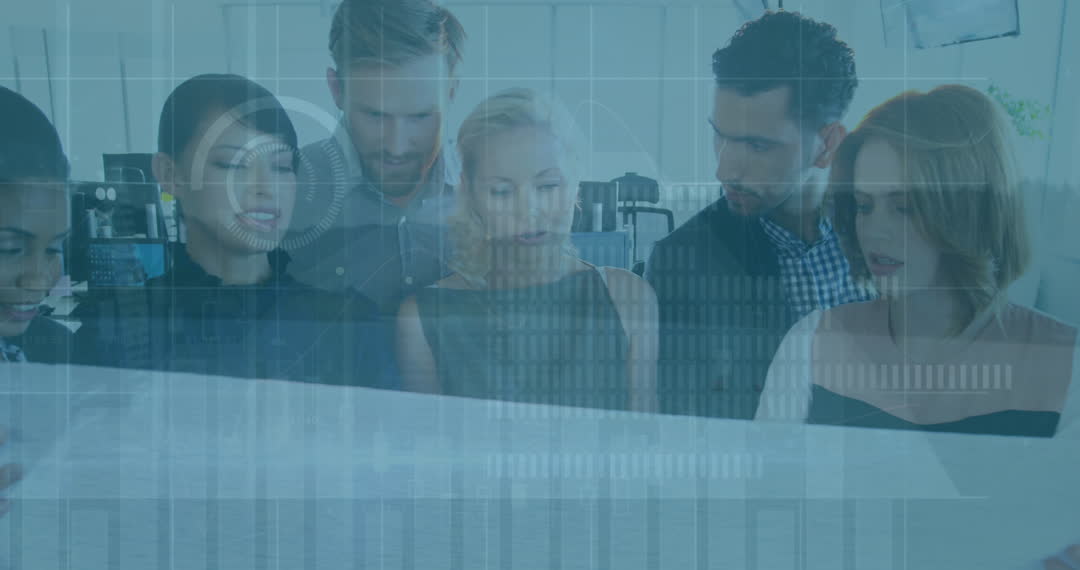 Group of diverse businesspeople closely analyzing a business plan amidst digital data elements, promoting teamwork, modern technology, and innovation in a professional setting. This is ideal for illustrating concepts such as collaborative thinking, corporate strategies, and the integration of technology in business solutions for marketing materials or business presentations.
