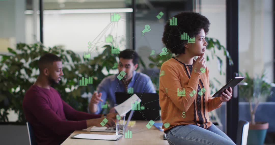 Three professionals engage in lively discussion around a table, focusing on data analyses visible with animated green charts. Ideal for illustrating modern business practices, technology-driven workplaces, and team collaboration in reports, presentations, or websites about analytics and corporate ecosystems.
