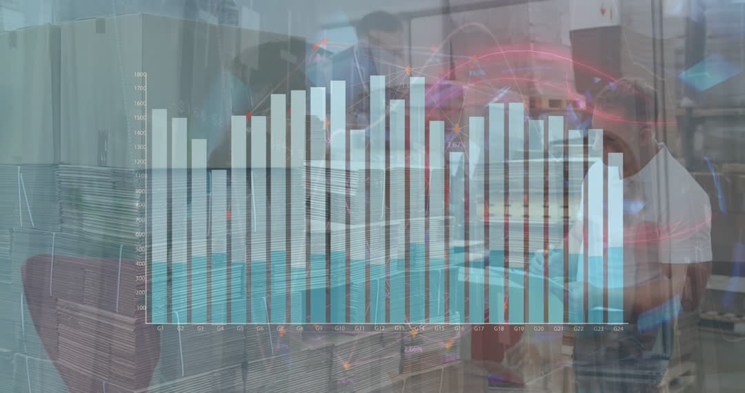 Overarching overlay of data charts with diverse team engaging in warehouse tasks signifies real-time data analysis and efficiency enhancements in logistic environments. Suitable for visuals in business analytics, global operations, and team collaboration promotions.