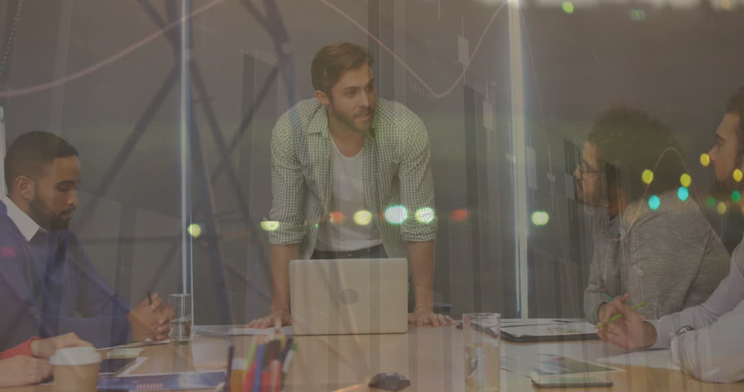 Diverse Team Analyzing Data with Financial Digital Overlay Video