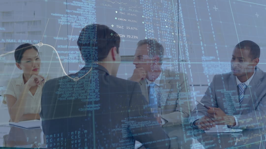 Diverse group of business professionals analyzing data overlaid with digital coding and graph, representing modern business strategies integrating technology. Ideal for illustrating themes of innovation in finance, teamwork in tech-driven environments, or the intersection of traditional business practices and new technologies.