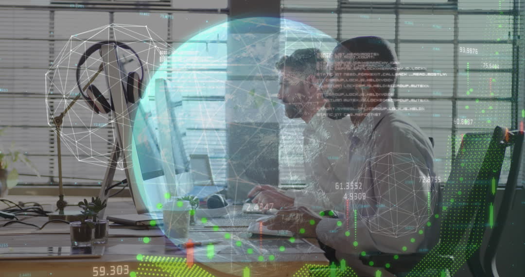 A diverse team is focusing on data analytics and digital global trends in a modern office environment. Various technological elements, like digital data processing and statistical representations, are superimposed on the video, highlighting their role in strategic decision-making. Ideal for use in articles, presentations, and websites about modern business practices, global economics, or team collaboration in tech-driven environments.