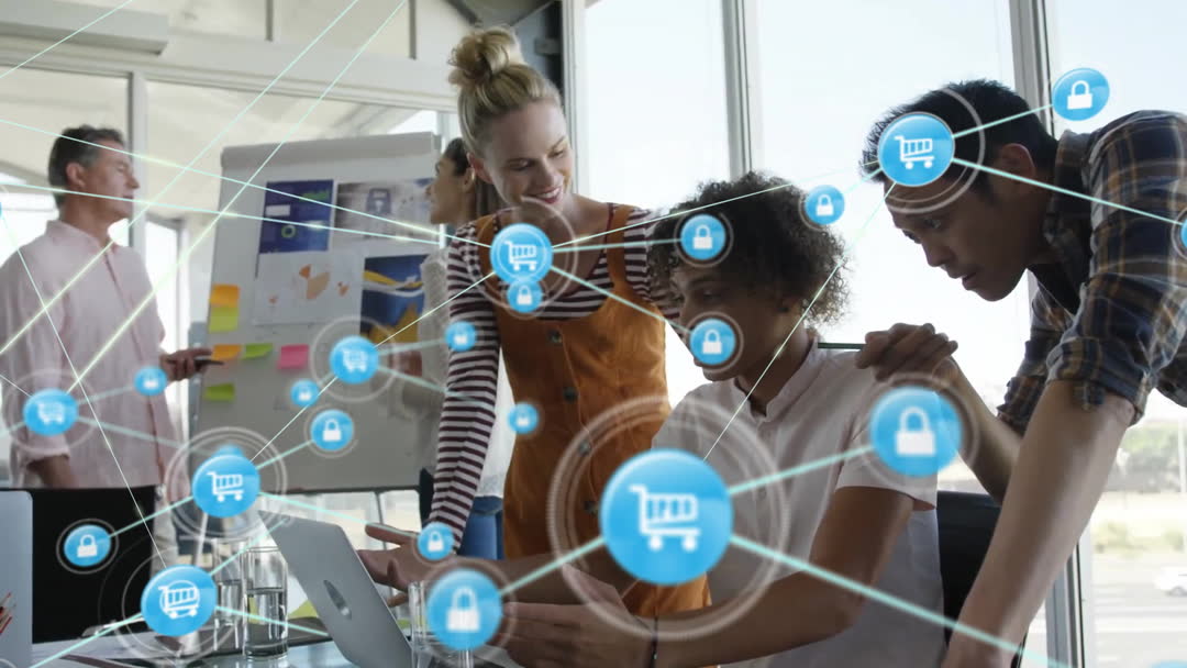 Diverse group of business professionals collaborating in a bright office, with digital concept overlays showing connectivity and e-commerce security. Suitable for illustrating teamwork, digital innovation, cyber security, technology, online sales growth, and modern business environments in advertising, presentations, and editorial content.