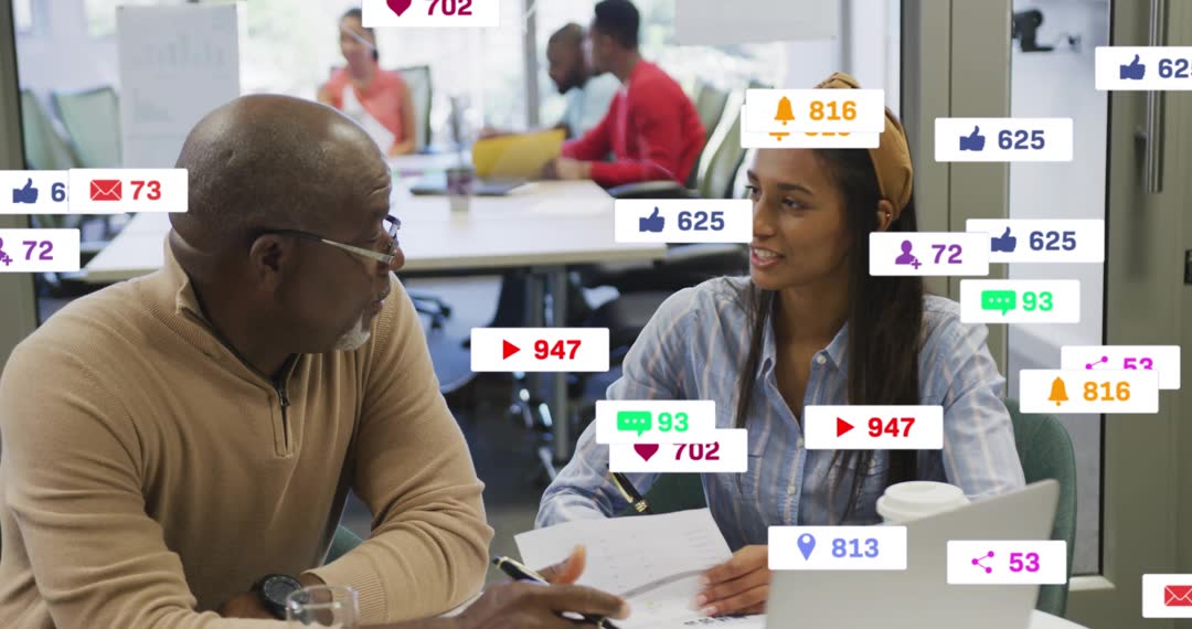 Mentor and mentee distributing printouts while examining digital marketing engagement floating icons. Setting in modern office showcases active discussion and collaboration in professional environment. Useful for themes around mentoring, teamwork strategies, the impact of data-driven decisions, or illustrating effective communication and divisive thinking in corporate marketing exercises.