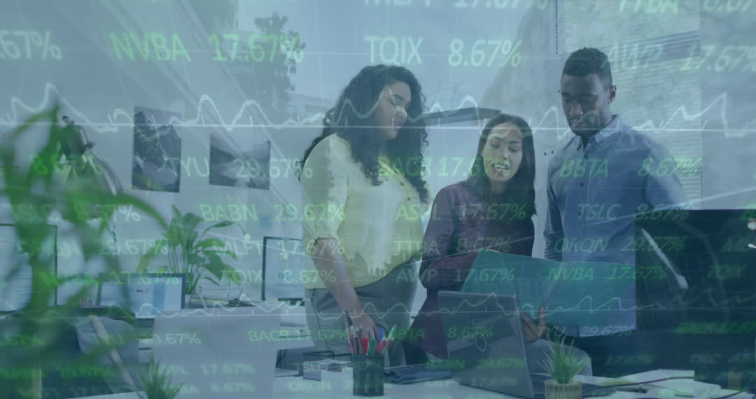 Three professionals engage in analyzing financial data, overlaid with green text displaying financial metrics and trends. This scene demonstrates teamwork, advanced technology, and data-driven decision-making in a modern business environment. Useful for illustrating business solutions, teamwork in finance, and dynamic corporate settings.