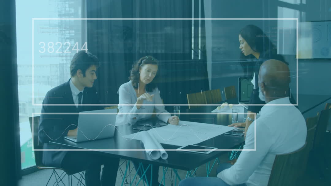 Diverse business team discussing financial data with digital compositing effects overlay. Ideal for illustrating concepts of modern business analytics, digital transformation in corporate environments, financial technology integration, and collaborative teamwork in offices. Useful in presentations, business reports, or articles about digital innovation and diversity in workplaces.