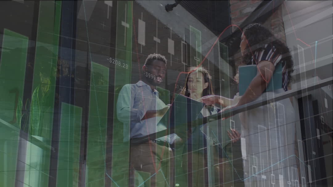 Three diverse professionals stand in modern office environment collaborating on financial analysis with a green digital data chart overlaid. Perfect for illustrating corporate financial success, teamwork dynamics, or modern business analytics strategies. Use in marketing materials to depict innovation and a data-driven approach.