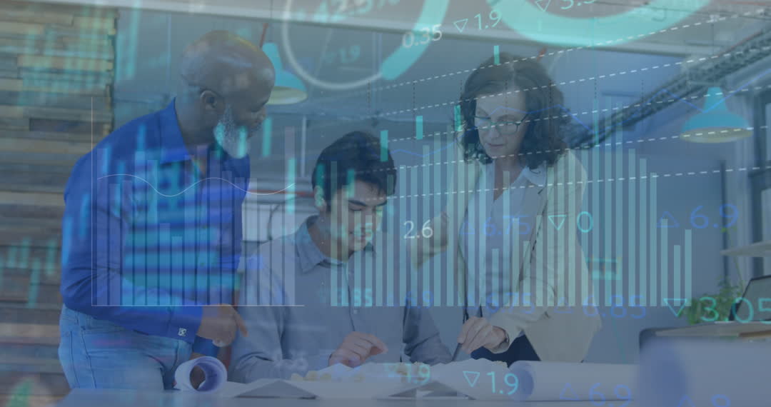 - Diverse Team Analyzing Financial Data with Statistics Overlay
