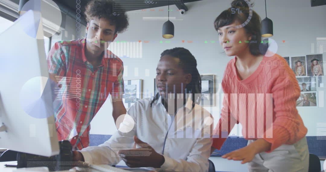 Diverse group of professionals standing around a desk, discussing and analyzing market data displayed on a monitor. Digital graphics overlay as visual presentation of data charts and stock market information. Perfect for content depicting technology on business reports, cryptocurrency trends, efficient teamwork, and data-driven decision making.