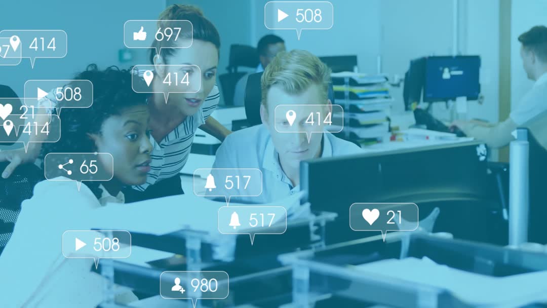 Diverse Team Analyzing Social Media Engagement Metrics on Office Screens Video