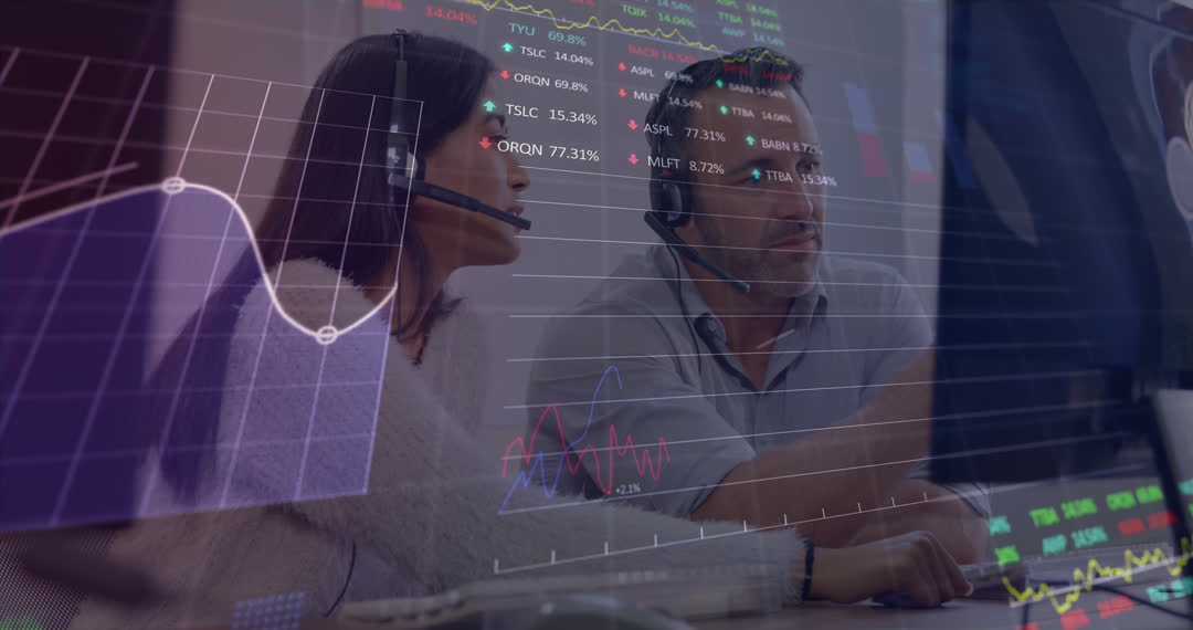 This visual illustrates diverse coworkers engaged in analyzing stock market reports overlaid with digital graphs and trading data. Ideal for conveying concepts of collaboration and technology in financial and business settings. Perfect for use in articles and presentations on stock trading, business consulting, financial planning, or technology in finance.