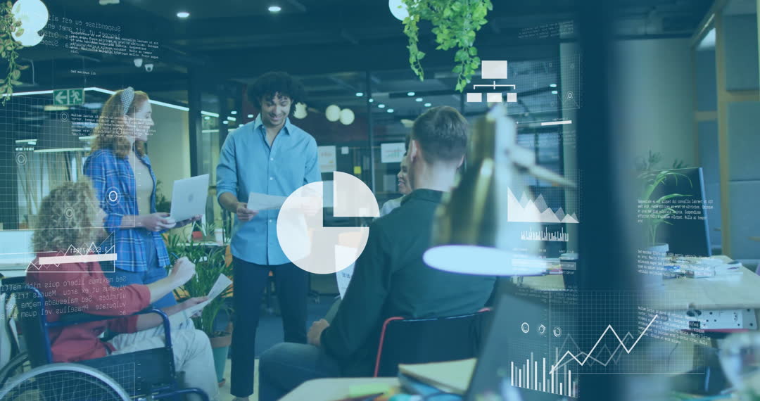 - Diverse Team Brainstorming with Data and Diagrams Overlay