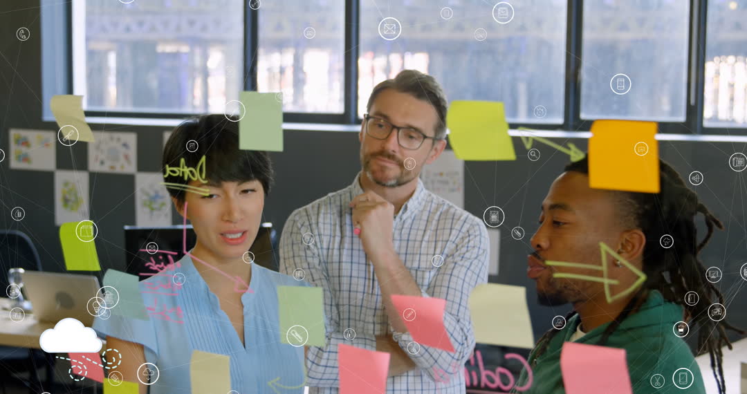 Colleagues of diverse backgrounds are brainstorming, using colorful sticky notes on a glass wall while digital-connected icons overlay, suggesting the importance of networking and technology in modern collaboration. Useful for representing teamwork, innovative thinking, strategic planning, and intersection of technology in workplace environments.
