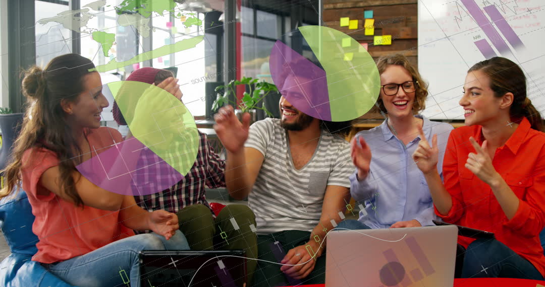 A group of diverse colleagues sits together in a modern office setting, enthusiastically high fiving, celebrating their achievement. Overlay graphics of statistical data give a futuristic and technology-driven atmosphere, symbolizing successful data processing and collaboration. Ideal for illustrating teamwork, technology in the workplace, data analysis, and multicultural work environments.