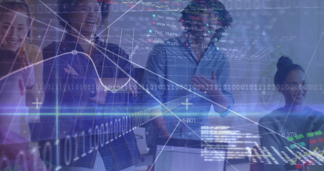 Group discussing financial growth amidst changing stock data, reflecting teamwork and success in investment strategies. Suited for business presentations, financial services, articles about market trends, or teamwork in a corporate environment.