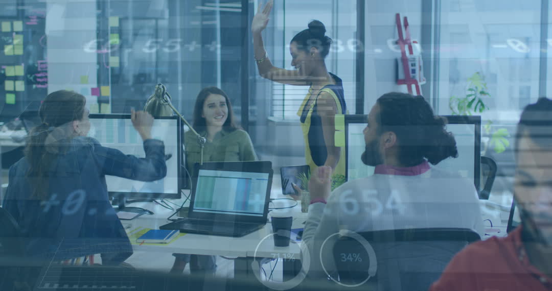 - Diverse Team Celebrating Success in Office with Tech Overlay