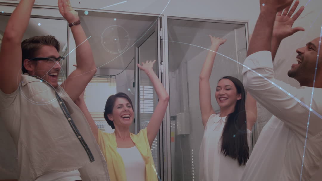 Diverse Team Celebrating Success with Digital Interface Overlay Video