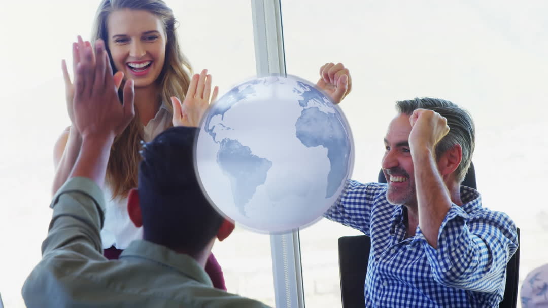 Team members engaging in a lively high five, symbolizing success and collaboration in a business environment. The rotating globe represents globalization and international teamwork. Ideal for illustrating concepts of multicultural collaborations, successful business endeavours, motivational teamwork scenes, and positivity in the workplace.