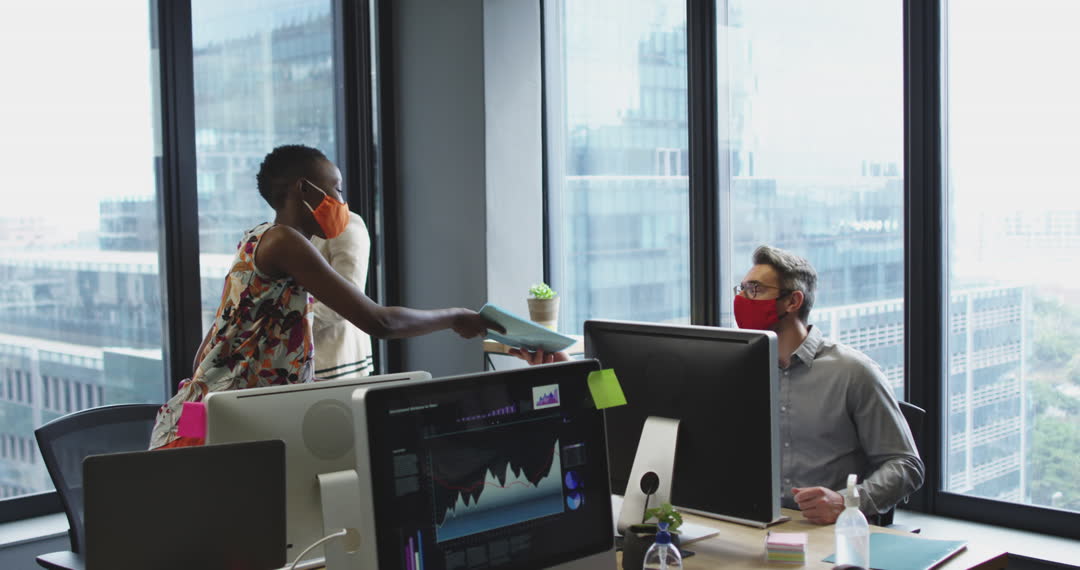 Diverse Team Collaborates with Mask Safety in Modern Office Video