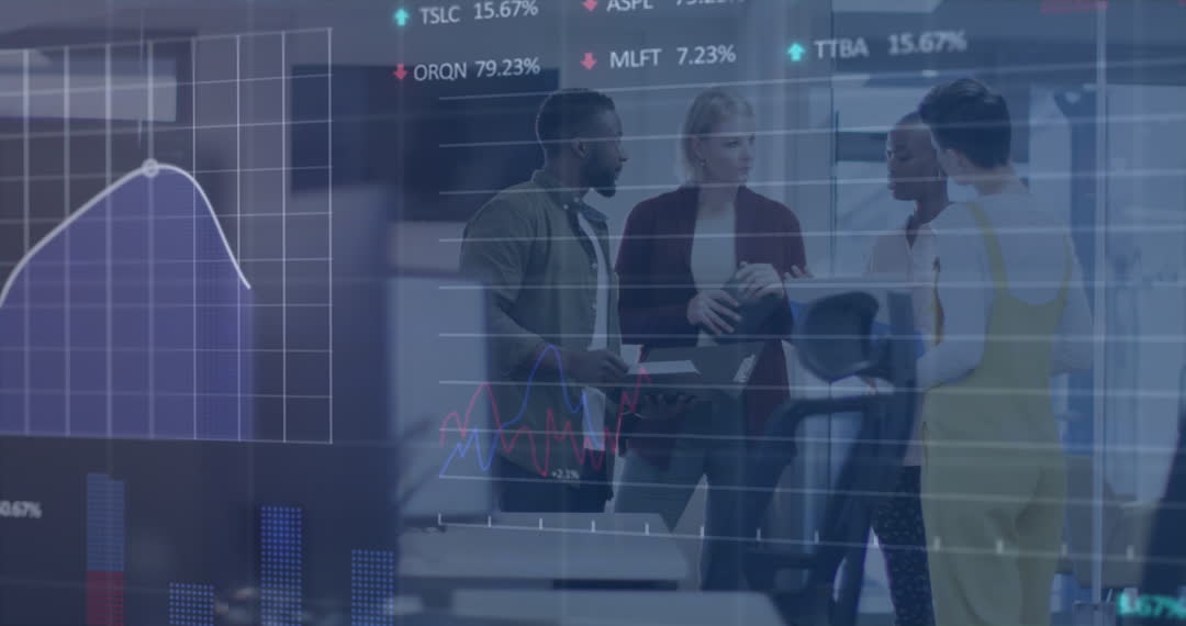 Overlay of financial charts and graphs plays while a diverse group of business professionals discusses in an office setting. Ideal for promoting finance, data analysis, teamwork, and innovative corporate environments.