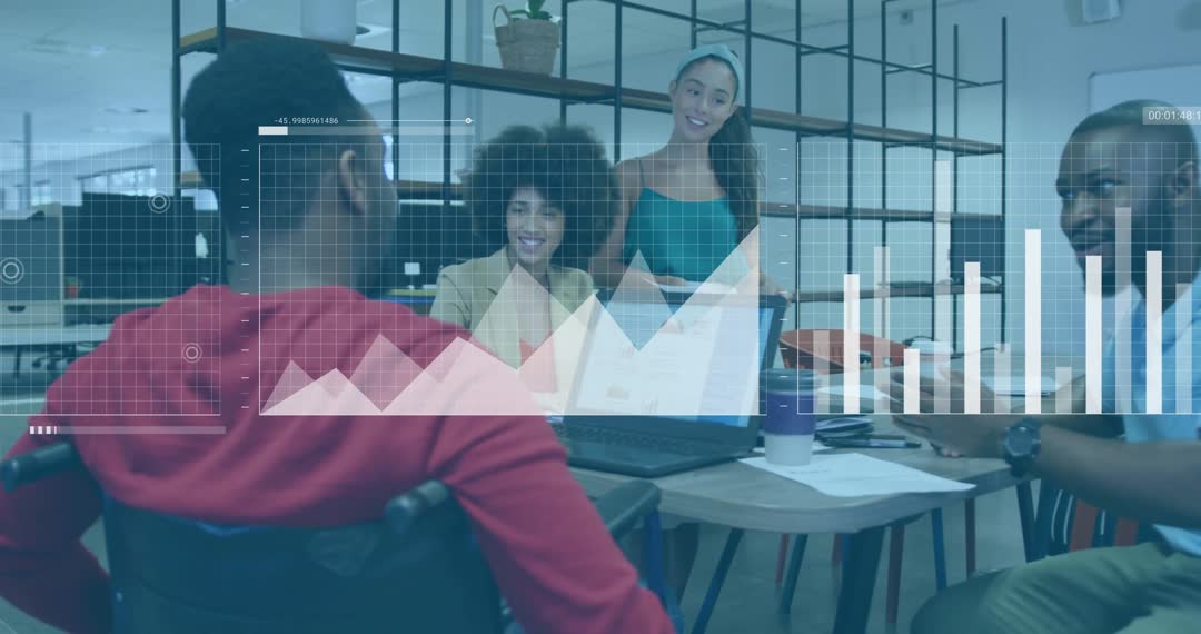 Shows diverse group collaborating over animated data charts, useful for illustrating teamwork, data analysis in business presentations, articles focusing on innovation and workplace diversity.