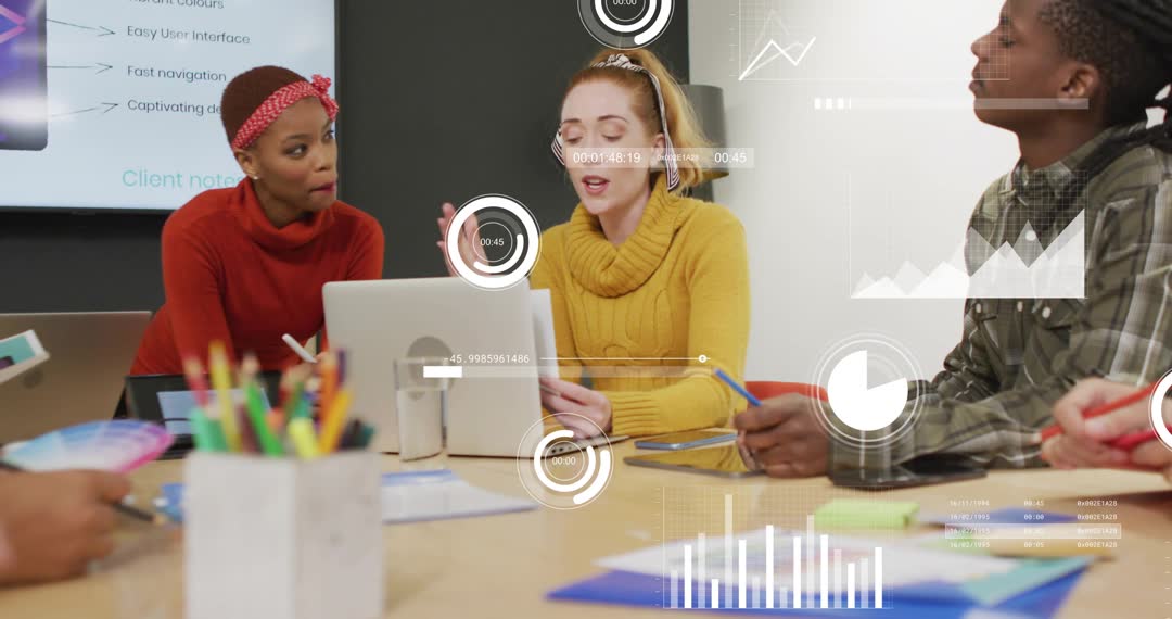 Video showing diverse team collaborating around conference table. Center speaker tapping tablet and explaining data insights while colleagues are listening and taking notes. Digital HUD charts, graphs, progress rings and bar graphs overlaying table, emphasizing data-driven decision making and real-time analytics. Clip working well for corporate presentations, training videos, pitch decks, technology product demos, marketing campaigns, social media ads, website hero banners, explainer videos and annual reports. Use for illustrating teamwork, collaboration, innovation, data visualization, user interface design and business strategy. Recommend using quick cuts, on-screen copy and lower-thirds to highlight key metrics. Available in horizontal format for web and broadcast.
