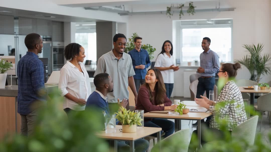 AI Generated Image. Video showing diverse group of coworkers smiling, chatting, and collaborating in bright open-plan office. Seated pair exchanging ideas while nearby colleagues approach and join conversation. Footage capturing casual standing meeting, small group discussion, and informal networking around communal tables. Natural light, indoor plants, and modern furniture creating warm collaborative atmosphere suitable for corporate marketing, recruitment, internal communications, training, and team culture campaigns. Featuring wide and mid shots, natural sound, and horizontal 16:9 framing for easy use as website hero, social media ad, presentation b-roll, onboarding video, or stock footage library. Licensing friendly for commercial projects and editorial use.