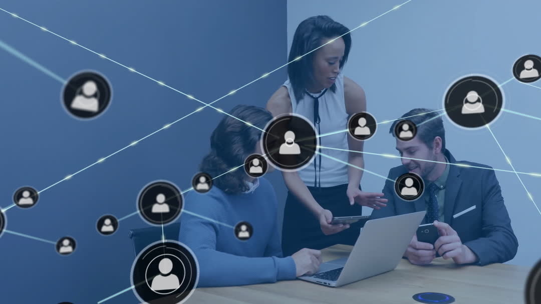 Diverse business professionals engaging in a collaborative work setting with digital icons of network connections symbolizing online communication and data exchange. This visual represents concepts of modern technology integration in business, teamwork, and global finance challenges. Ideal for conveying digital transformation, remote work culture, and communication strategies in contemporary organizations.