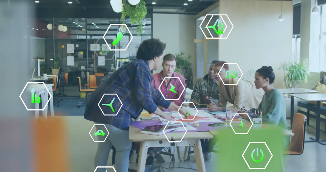 Diverse team interacting around table in modern office surrounded by futuristic hexagonal icons related to business, recycling, and hazards. This visual is effective for themes involving innovation, sustainable business practices, digital strategy sessions, or technology-driven collaboration. Ideal for use in materials demonstrating corporate teamwork, forward-thinking methodologies, and digital transformation strategies.